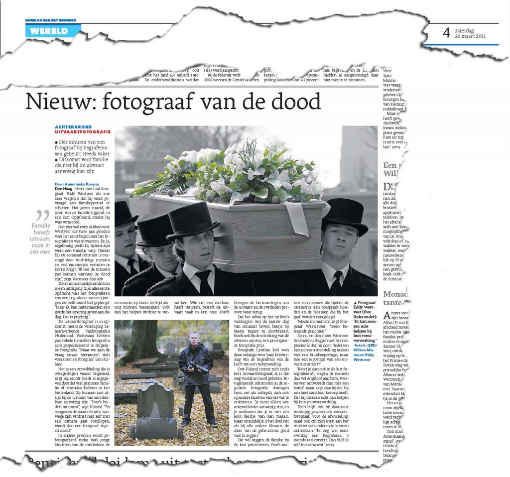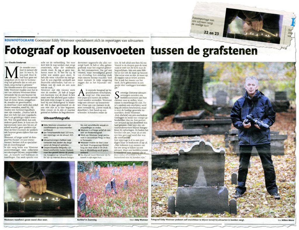 Een andere service die ik vanaf 10 juli 2009 bied is het maken van een uitvaartreportage. Een fraai fotoboek met beelden van begrafenis en/of uitvaartdienst zorgt voor een blijvende herinnering. Het boek kan ook voor de nabestaanden die niet aanwezig zijn of het (nog) niet beseffen een waardevol document zijn. De te fotograferen onderwerpen en momenten bepaal ik graag in nauw overleg. In alle gevallen beweeg ik me zo discreet en onopvallend mogelijk.